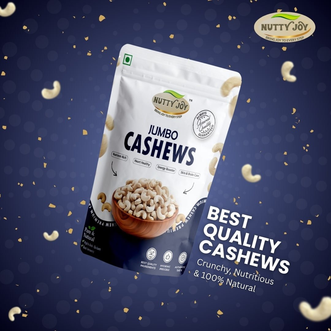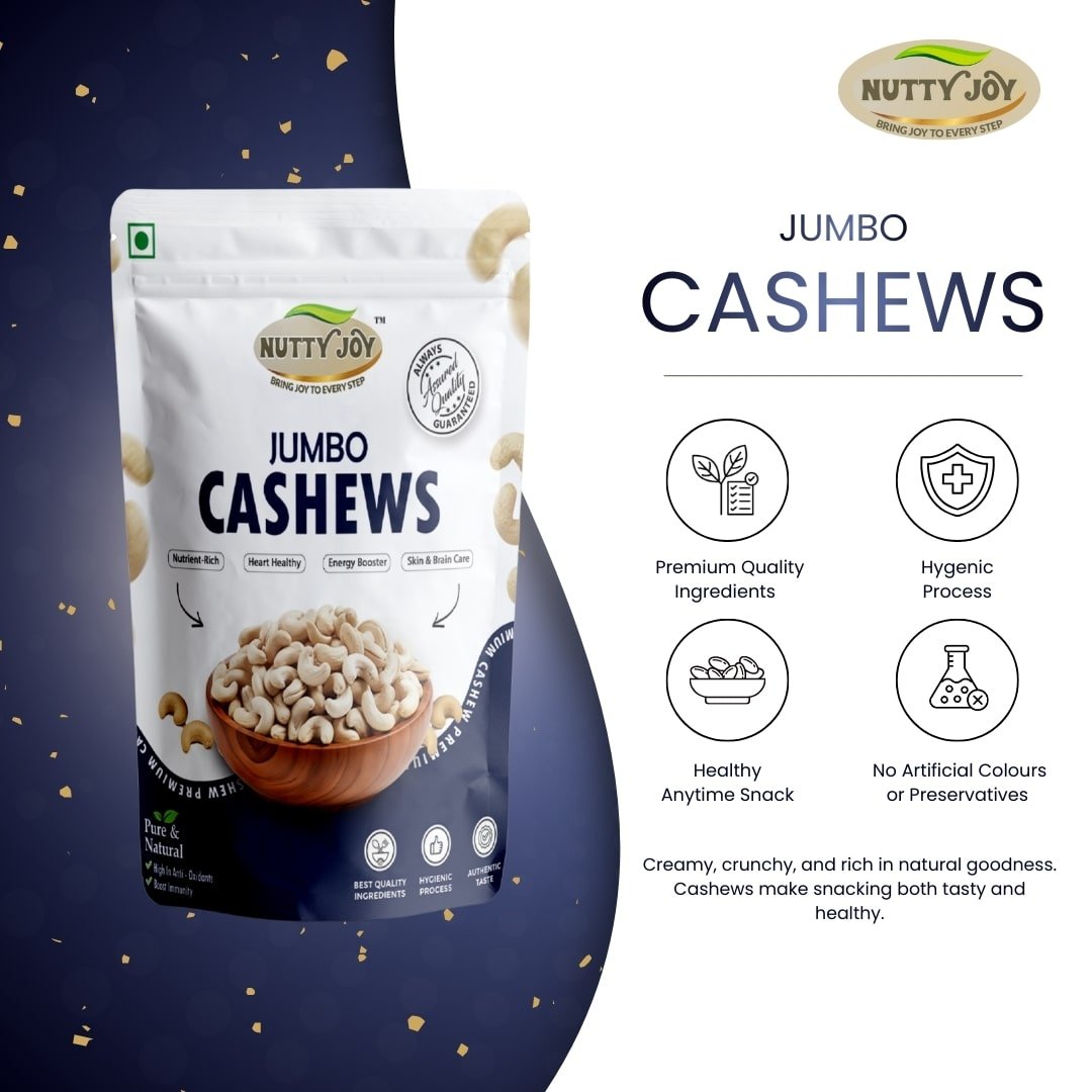 Whether at home, office, travel, or gifting, Jumbo Cashews add a touch of luxury to every moment. Celebrate the joy of premium snacking with the richness of Nutty Joy Cashews.